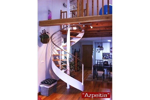La escalera es de estructura helicoidal y se ha instalado en un precioso caserío, cuyos amplios espacios han permitido la colocación de una escalera de estas características. Con un diámetro de 1700mm, permitiendo la colocación de peldaños anchos, muy cómodos para su uso.